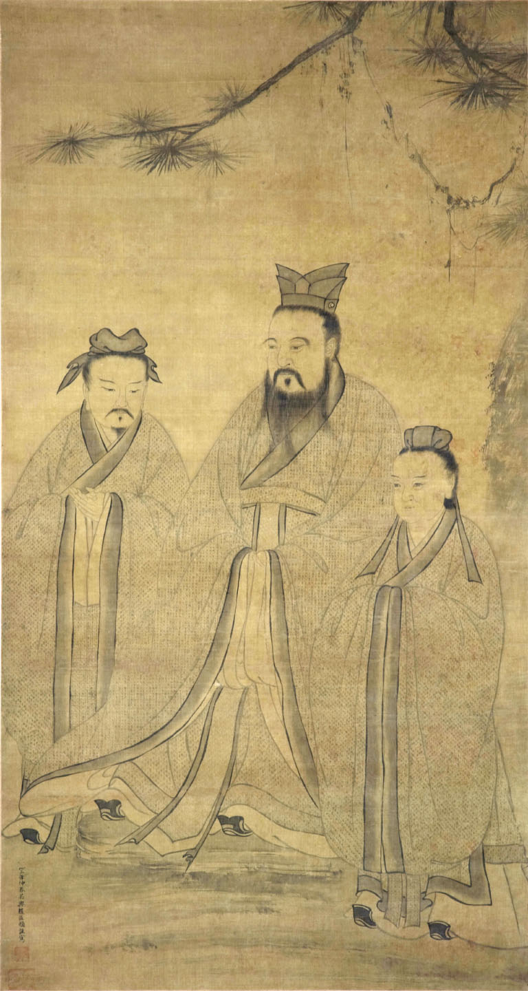 绢本设色,工笔淡彩。画面中间老者为孔子,礼冠玄衣,腰垂韦鞸,素袍乌履,神态端庄安详,目光神凝前方,透射出深邃的思想和无穷的智慧。站立者左为弟子颜回,右为弟子曾参,二弟子头着巾帻,身穿镶缘素服,秉手垂立,表现出礼毕恭毕敬的样子,侍立两旁。人物神态生动逼真,衣纹线条流畅。最为让人惊叹的是,三人的衣服上用工笔小楷书写着整部《论语》,字体端庄秀丽。如果站在画前不仔细观察是发现不了的,只有走近仔细观赏,才能看清工整紧密的字迹。画作款署"大德三年仲春吴兴赵孟頫谨写"。即元大德三年为公元1299年,经文物鉴定专家鉴定伪款。此件品虽然不是名家作品,但是画作者创意独特,匠心独运,巧妙将绘画与书法结合在一起,别具风格,令人叫绝。