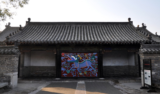 孔府内宅门里的这幅彩色壁画,称为“戒贪图”。画中貌似麒麟的动物,就是传说中的“贪”。贪是天界中的神兽,是龙生九子中的第九子,虽然状似麒麟,但其本质却与麒麟有着天壤之别。麒麟为仁兽,造福人类,民间就有麒麟送子的传说。只要麒麟一出现,就是美好的兆头,一定会给人们带来喜庆吉祥。而贪则是贪婪之兽,其生性饕餮,贪得无厌。壁画上贪四周的彩云中,全是被其占有的宝物,包括了“八仙过海”中的八位神仙赖以漂洋过海的宝贝,应有尽有。但它并不满足,仍目不转睛地对着太阳张开血盆大口,妄图将太阳吞入腹中,占为己有。可谓野心极大,欲壑难填,最后落了个葬身大海的可悲下场。衍圣公画此图于宅门内出口壁上,是提醒自己、家人并告诫子孙为官应当清正廉洁,不要贪得无厌、徇私枉法。