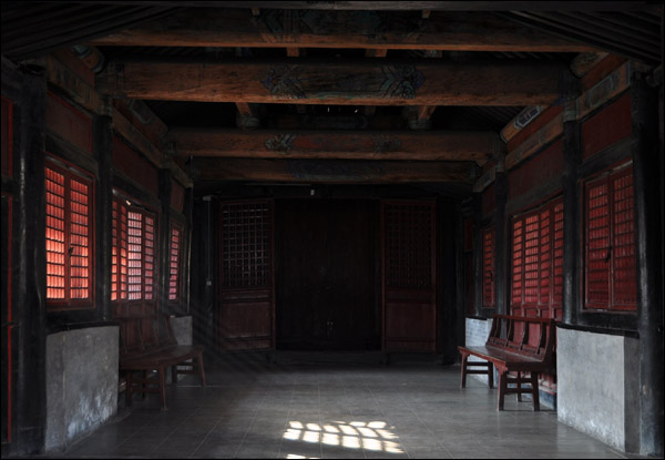 通廊里这两条靠背红漆长凳,俗称“阁老凳”。