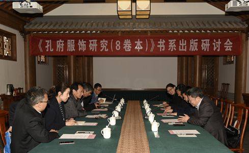 4月27日,由东华大学出版社、上海市纺织服装研究出版中心联合曲阜市文物局由举办的“《孔府服饰研究(8卷本)》书系出版研讨会”在曲阜隆重召开。上海市新闻出版局局长徐炯、副局长彭卫国、出版管理处处长王莳骏,东华大学服装与艺术设计学院教授张文斌、上海戏剧学院副教授邵旻,东华大学出版社社长蒋智威、副编审吴川灵、编辑赵春园,孔子研究院原副院长孔祥林,曲阜市文物管理委员会副主任周鹏及孔子博物馆主要负责同志参加会议。