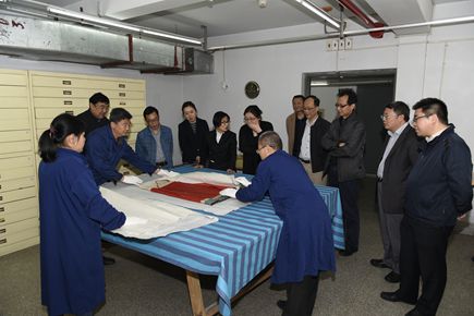 研讨会前,各位专家、学者现场察看了馆藏孔府服饰保护管理现状,共同鉴赏了孔府旧藏服饰工艺。