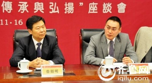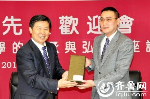 孔子第79代嫡长孙、中华大成至圣先师孔子协会会长孔垂长(右)和山东大学校长徐显明(左)出席“孔垂长先生欢迎会暨海峡两岸‘儒学的传承与弘扬’座谈会”