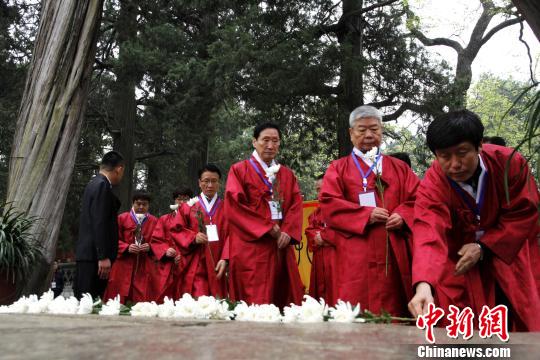 来自韩国的孔子后裔向孔子墓献花、行礼。