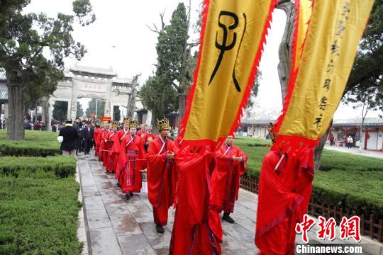 4月5日,戊戌年清明孔子后裔墓祭礼在山东曲阜孔林举行。孔子后裔在乐舞生的带领下,沿神道走向孔子墓。