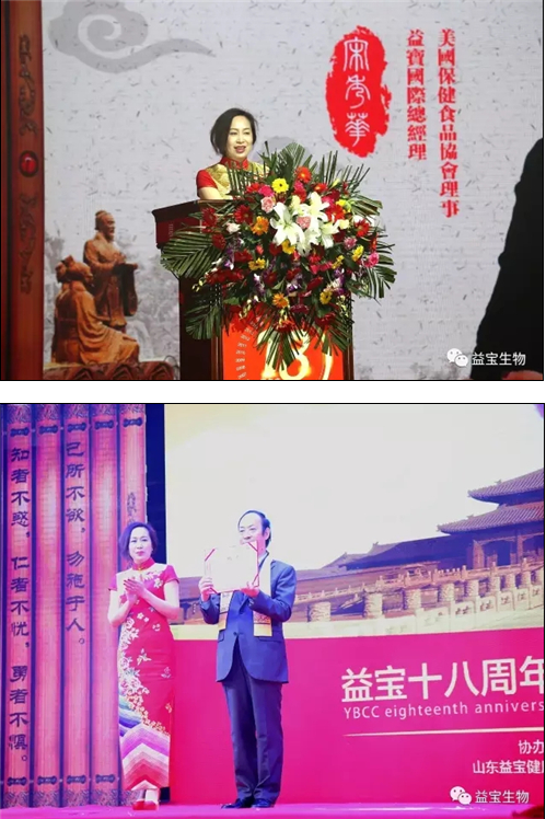 世界孔子后裔宗亲联谊总会、北京秘书长孔祥贞代读世界孔子后裔联谊会会长孔德墉贺词,孔老先生首先对益宝成立十八周年所取得的巨大成就表示热烈祝贺。并授予益宝国际为中华孔子学会孔子后裔儒学促进会理事单位。台湾孔子协会秘书长孔令瑜先生对益宝国际表示衷心的祝福。