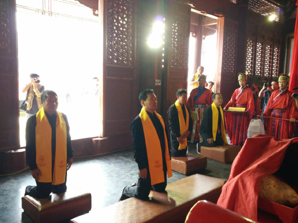 圣像揭幕仪式后,济源丁酉年秋季祭孔大典主祭官孔红生带领济源孔子联谊会负责人孔繁锋、孔祥念、孔令杰、孔建波以三献礼庄重祭祖。