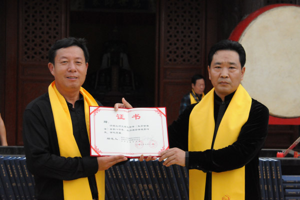 孔红生会长向三河文庙捐赠全套80册《孔子世家谱》。济源孔子联谊会会长孔令杰代表济源孔子后裔接受捐赠。