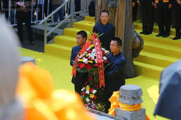 山东省委、省人大、省政府、省政协敬献花篮。全体来宾佩戴祭孔专用绶带,庄严肃立,整理衣冠,面谒至圣先师孔子行鞠躬礼。