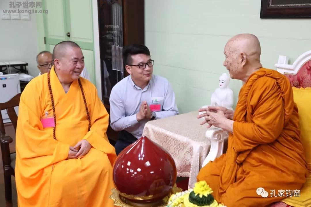 5月28日下午,中国佛教代表团一行在在切塔上将的陪同下,永信大和尚一行拜访了泰国第20任僧王、91岁高龄的颂提帕玛哈穆尼翁长老,持赠孔家钧窑《寿桃》,祝福僧王寿康。共同祝愿中泰双方国泰民安,中泰关系亲如一家。