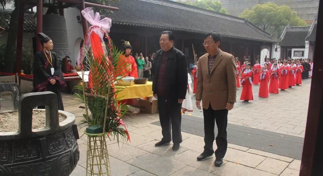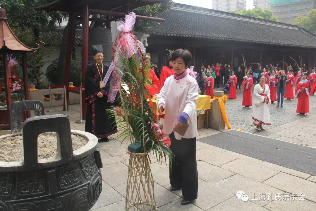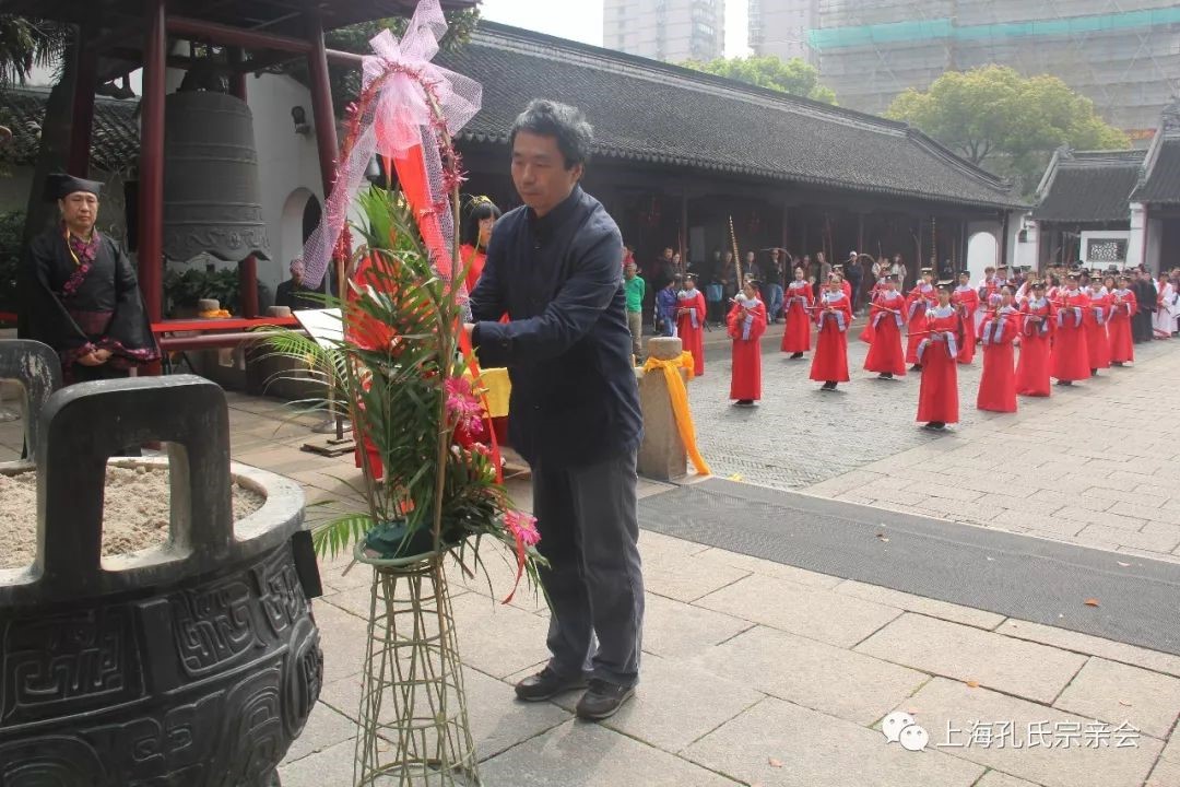 上海炎黄文化研究会潘为民秘书长、曹金荣监事;上海炎黄文化研究会孔子文化专业委员会刘社建副主任;上海文庙管理处刘栩主任;上海敬业初级中学苏敏副校长;福建省军区原政委陆凤彬将军等领导和嘉宾登月台向至圣先师孔子敬献了花篮,并三鞠躬致礼。
