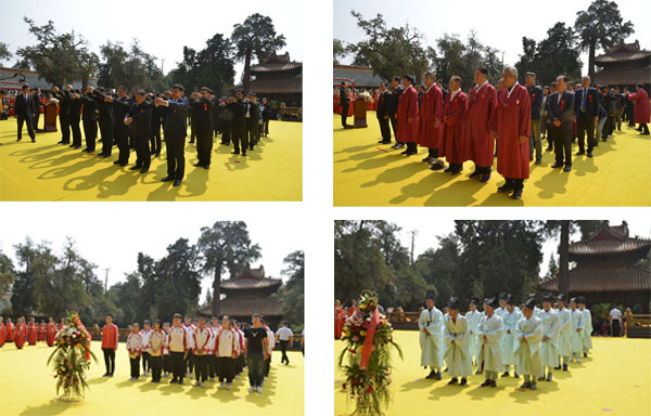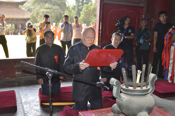 世界孔子后裔联谊总会会长、中华孔子学会孔子后裔儒学促进委员会会长、孔子世家谱常态化续修工作协会荣誉会长兼执行会长孔德墉恭读祭文。各地孔子后裔代表,颜子、曾子、孟子、卜子、公冶、步叔后裔代表分组以传统释奠叩拜礼表达了对孔子的追思和缅怀。参加祭祀的优秀教师、学生代表、儒商代表、韩国华城阙里祠代表等分别向至圣先师行礼并敬献了花篮。