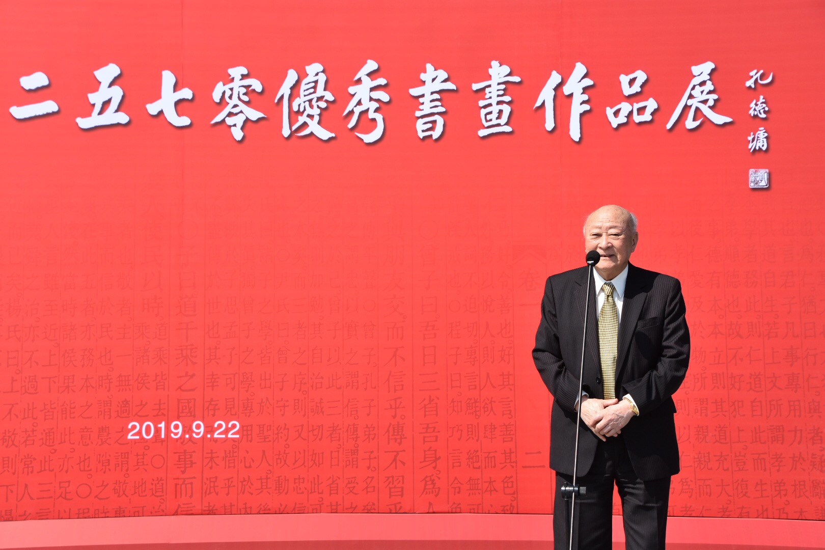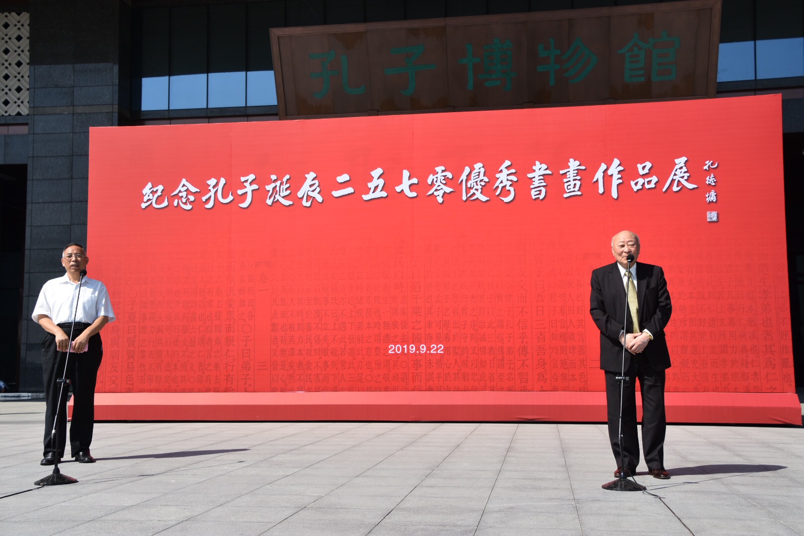 诗礼传家,翰墨丹青。在庆祝中华人民共和国70周年华诞之际,由中华孔子学会孔子后裔儒学促进委员会联合孔子博物馆、世界孔子后裔联谊总会、至圣孔子基金会、韩国曲阜孔氏大宗会等联合主办的“纪念孔子诞辰2570年优秀书画作品展”于9月22日上午在孔子博物馆隆重开展。孔子博物馆原馆长孔德平主持开展仪式。