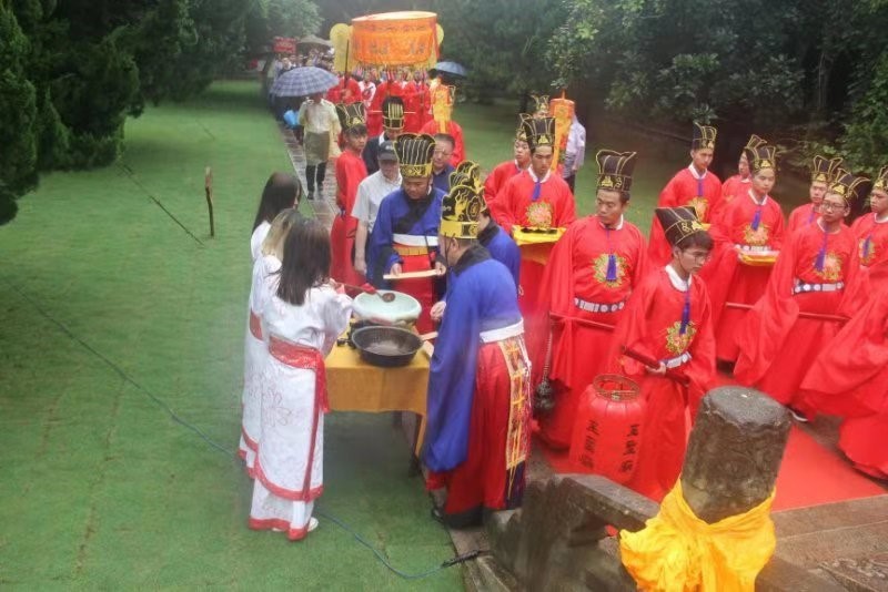 当日上午,受台风影响,嘉定区下起了倾盆大雨,但所有准备工作依然有条不紊地按计划进行。到十点左右,天公作美,大雨骤停,来宾们在庙门外列队静候,10点10分大典正式开始。击鼓鸣钟、鸣号儆戒后,大家跟随鸣赞官的口令进庙行礼。经过请神、迎神、初献、亚献、终献、撤馔、望燎、送神等环节,主祭官、陪祭官、分献官带领全体参礼人员,以古朴、庄严、凝重的传统礼节祭祀大成至圣先师孔子,展现了"千古礼乐归东鲁、万古衣冠拜素王"的盛况。