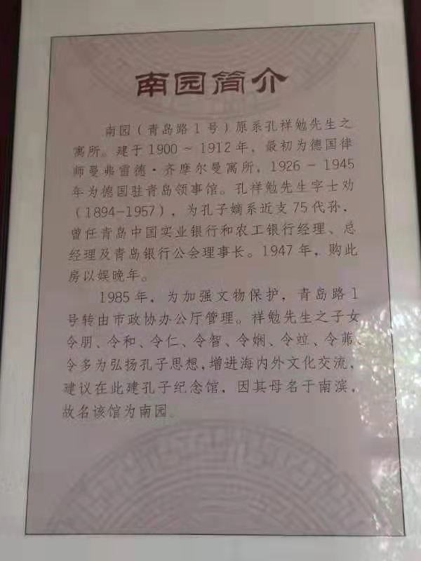 青岛市青岛路一号始建于1900年,曾是德国领事馆,1947年被孔氏八府长孙孔祥勉先生(孔德予先生祖父)购得作为住宅。1985年孔祥勉子女八人共同将其捐赠给青岛市政府,自此青岛路一号被命名为“南园孔子纪念馆”。
