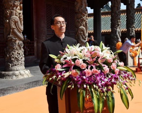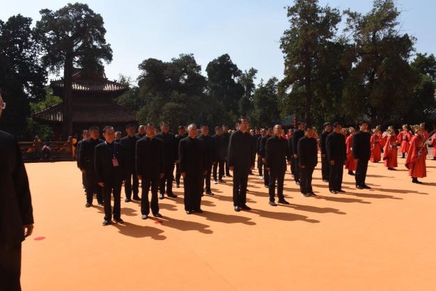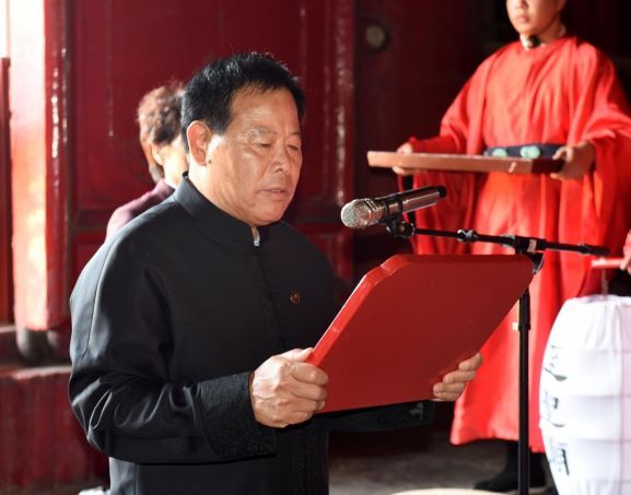 惟公元二零二二年,壬寅之秋圣祖孔子诞辰吉日,中华孔子学会孔子后裔儒学促进委员会副会长、中国孔庙保护协会名誉会长、曲阜孔子儒学促进会会长、曲阜市政协原主席孔令玉诚率阙里宗亲代表,敢奉彝章,敬陈明荐,谨以香帛牺牲粢盛贡品,祭告于圣祖大成至圣先师孔子暨列祖列宗。曰:
