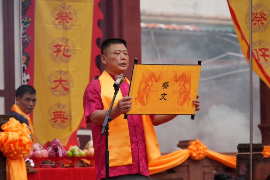 中华孔子学会孔子后裔儒学促进专业委员会副秘书长孔祥于、理事孔繁明、会员孔祥权、孔宪区、孔垂龙参加了祭孔大典。来自玉林市各县(市、区)孔子后裔,桂林、梧州、贵港、钦州、广东省等地孔子后裔代表,北流市委宣传部、文旅局、博物馆、孔庙管委会、玉林市曾子文化研究会、岑溪市儒学文化促进会、北流体育运动学校、北流机关第二幼儿园等单位领导嘉宾,以及颜、曾、孟、卜、朱圣哲后裔代表、社会各界人士等400多人,以虔诚之心、敬仰之情,谨备鲜花疏果,三牲美酒,肃祭大成至圣先师孔子。