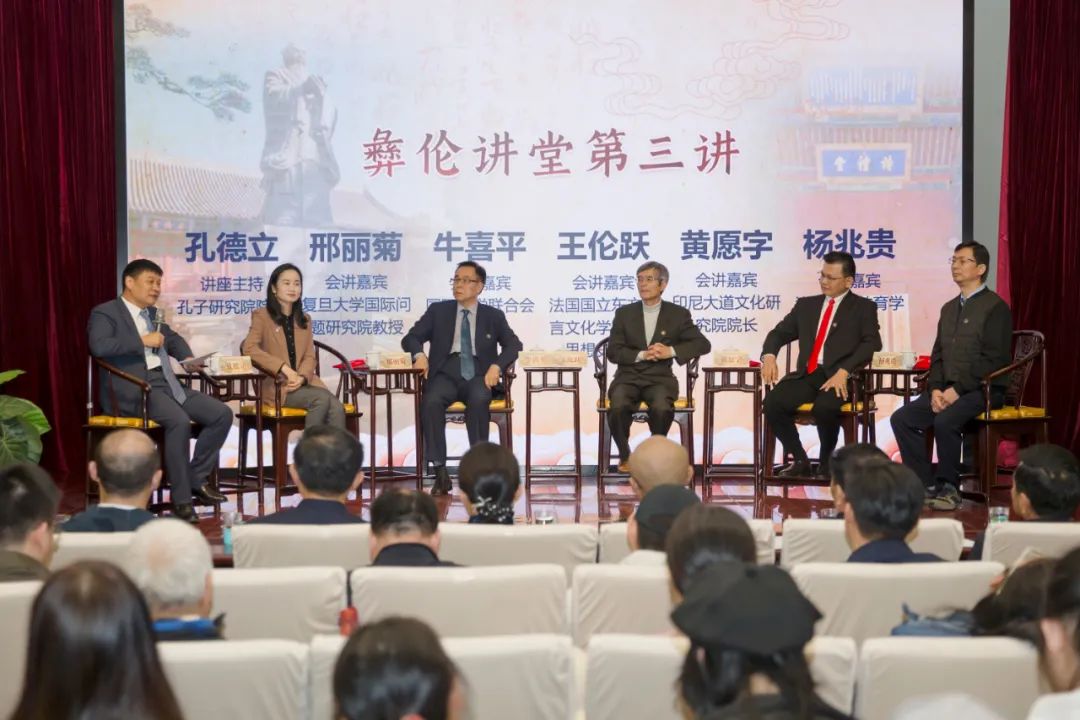 10月20日,彝伦讲堂第三讲以会讲形式展开。国际儒学联合会副会长牛喜平,法国国立东方语言文化学院中国思想史教授、中山大学人文高研院驻访学者王论跃(Frédéric Wang),印尼和谐文化基金会会长、印尼大道文化研究院院长黄愿字,澳门大学教育学院教授杨兆贵,复旦大学国际问题研究院教授邢丽菊,巴黎西岱大学汉学教授毕游塞(Sebastien BILLIOUD),孔子研究院党委副书记、院长孔德立等专家学者围绕“儒学的海外传播与文明互鉴”这一主题,就儒学在海外的传播、发展和影响,以及如何推动世界各国间文明交流互鉴进行深入探讨。