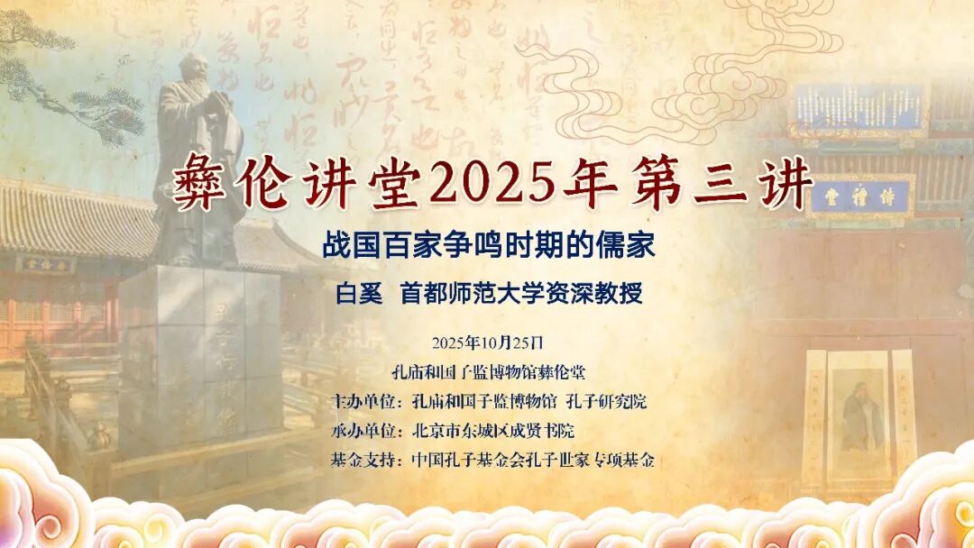 10月25日上午,由孔子研究院、孔庙和国子监博物馆联合主办,北京市东城区成贤书院承办,中国孔子基金会孔子世家专项基金支持的彝伦讲堂2025年第三讲在孔庙和国子监博物馆彝伦堂举办。首都师范大学资深教授白奚受邀担任主讲嘉宾,作题为“战国百家争鸣时期的儒家”的学术报告。