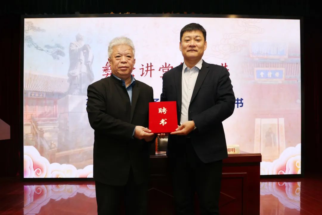 孔德立向杨朝明教授颁发彝伦讲堂主讲教师荣誉证书。