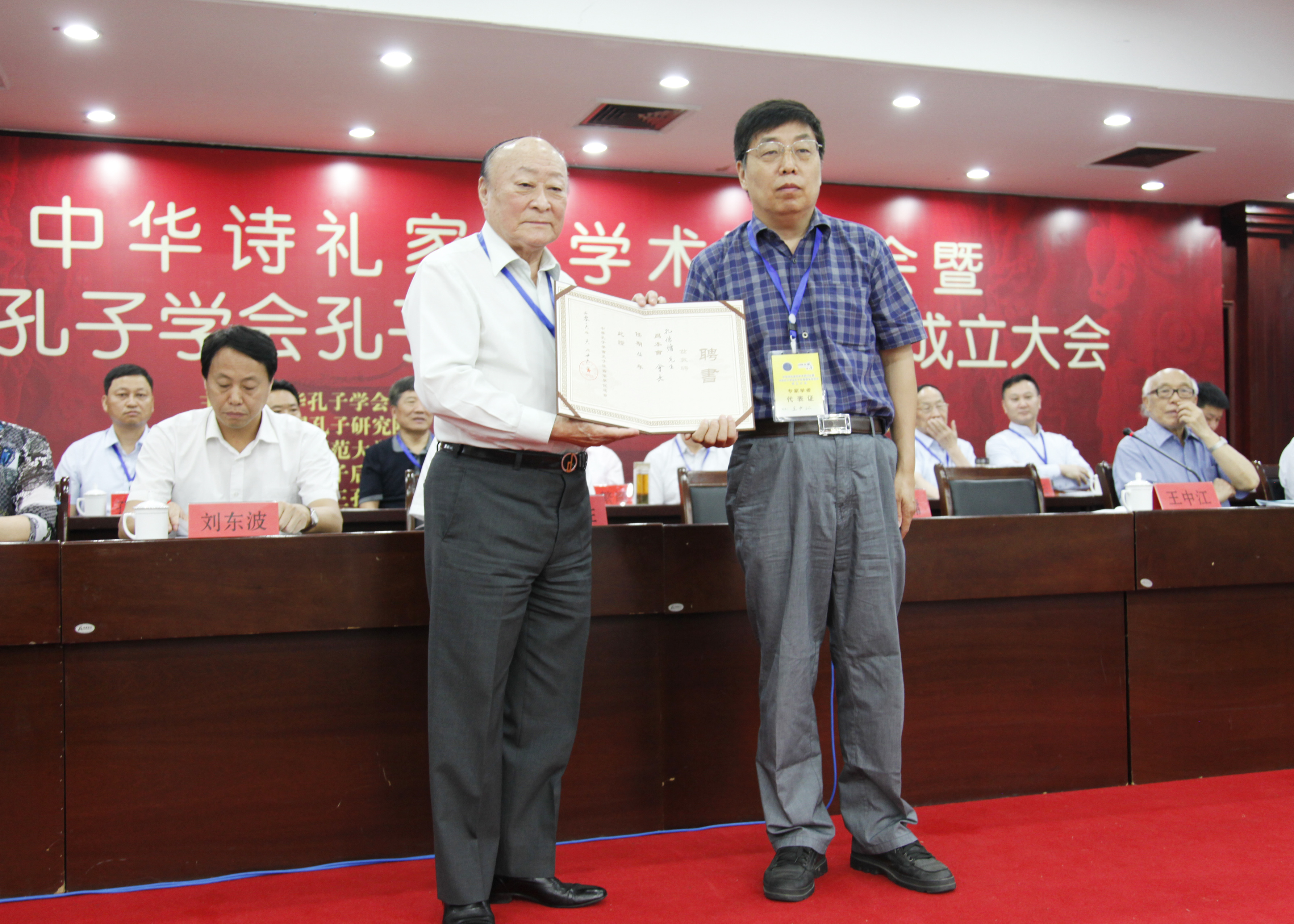中华孔子学会会长王中江为孔子后裔儒学促进会成立大会选举产生的首任会长孔德墉先生颁发聘书。