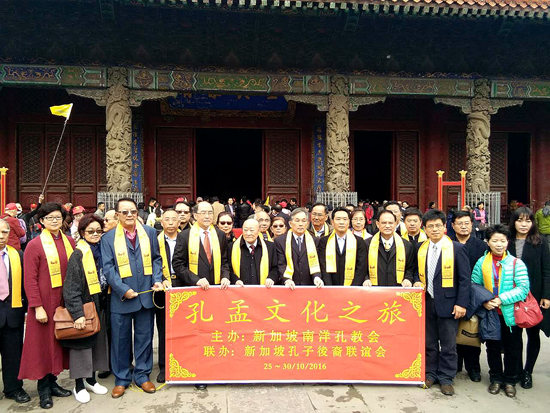 2016年10月27-28日,新加坡南洋孔教会与新加坡孔子后裔联谊会“孔孟文化之旅”一行抵达孔子故里曲阜,拜谒至圣孔子,访问世界孔子后裔联谊总会、孔子世家谱常态化续修工作协会、中华孔子学会孔子后裔儒学促进会。世界孔子后裔联谊总会会长、孔子世家谱常态化续修工作协会荣誉会长兼执行会长、中华孔子学会孔子后裔儒学促进会会长孔德墉,世界孔子后裔联谊总会副会长、曲阜孔子后裔联谊会会长、中华孔子学会孔子后裔儒学促进会副会长、曲阜市政协主席孔令玉,曲阜市政府副市长褚福梅,曲阜孔子后裔联谊会常务副会长兼秘书长、曲阜市文物局局长孔德平,世界孔子后裔联谊总会副会长、河南孔子后裔联谊会会长、中华孔子学会孔子后裔儒学促进会副会长、河南孔家钧窑文化艺术有限公司董事长孔红生,与到访的新加坡孔教会郭文龙会长、新加坡孔子后裔联谊会孔繁樑会长一行进行了友好交流活动。