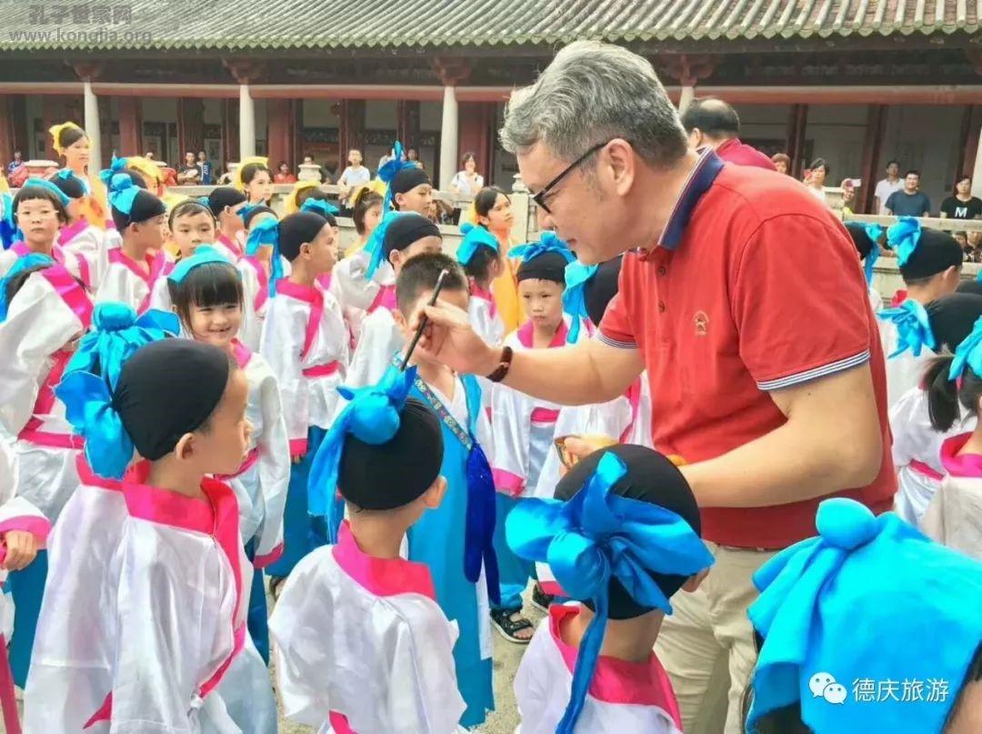 孔耀昌会长亲自为孔氏后裔们点朱砂开智。眉心间一点朱砂,象征着孩子添智添慧,是一个聪明的孩子了。
