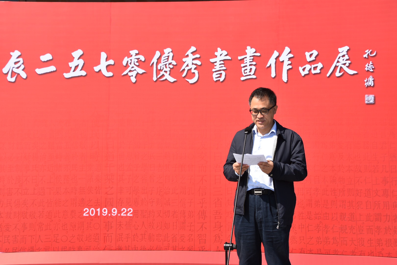 中华孔子学会孔子后裔儒学促进委员会副会长、曲阜市政协主席、书画展组委会主任孔令玉,中华孔子学会孔子后裔儒学促进委员会常务理事、中国美协理事、民革中央画院院长、山东省中国画学会会长、山东省画院联盟主席、山东画院院长孔维克,中华孔子学会孔子后裔儒学促进委员会顾问、原广州军区副参谋长、少将、广东省文史研究馆馆员、文史馆书法院名誉院长孔见,至圣孔子基金会执行长陈泰旭先生分别致辞。