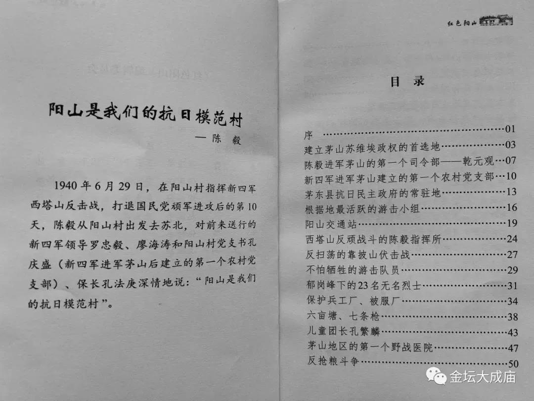 考察后,张根水主任回去向领导作了汇报。谢锁生主任随后亲自带有关部门一行八人来阳山考证。考证后让我配合张根水主任组织文字材料,宣传红色阳山。张主任将我阳山茅东县抗日民主政府的照片登上红色地图。乘金坛区党代会召开,他将地图资料分发给与会代表。为了进一步引起区政府的重视,张主任和我共同挖掘考证阳山村的历史资料,并参考我爸的回忆录、《金坛革命斗争史》、《江苏人民革命斗争群英谱》等史料为基础,进一步釆访村里的孔须发等老人,编辑《红色阳山》。书中着重介绍了陈毅在西塔山反顽之战结束后,前往苏北处理重要军务时,向二支队廖、罗两位司令交待工作,称赞阳山是抗日模范村。