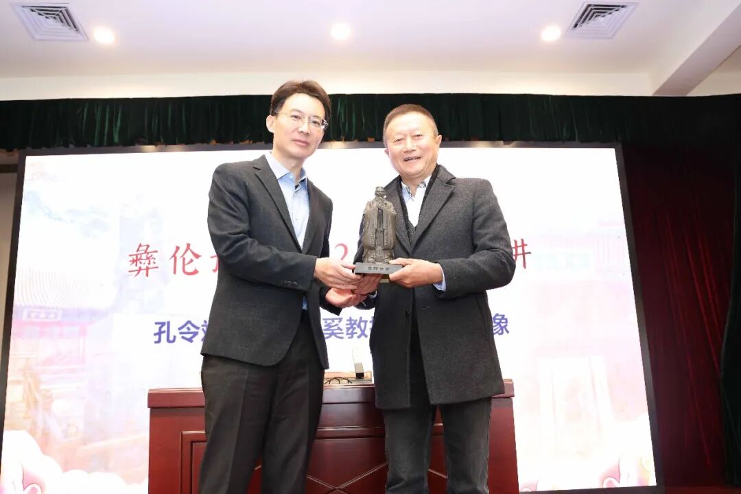 中国孔子基金会孔子世家专项基金管委会委主任、北京洲际兄弟影视文化有限公司董事长孔令斌向白奚教授颁赠孔子像。