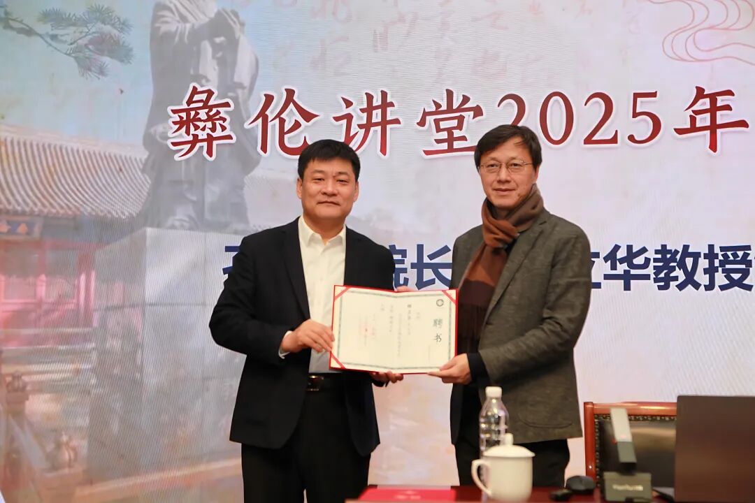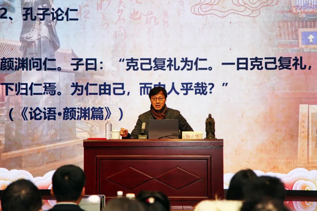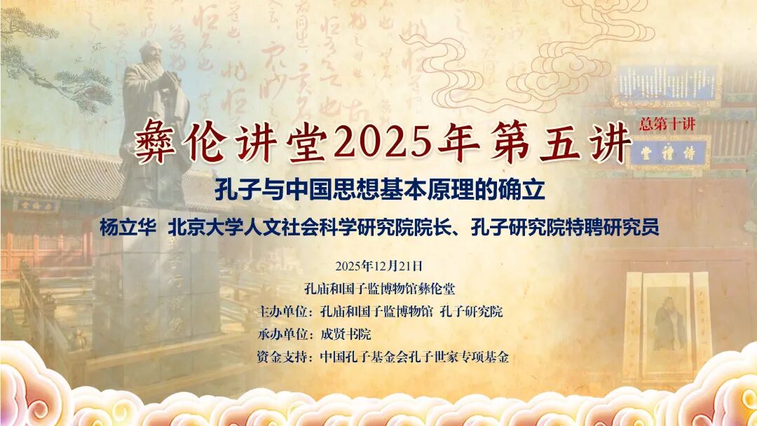 12月21日下午,由孔子研究院、孔庙和国子监博物馆联合主办,成贤书院承办,中国孔子基金会孔子世家专项基金支持的彝伦讲堂2025年第五讲(总第十讲)在孔庙和国子监博物馆彝伦堂举办。北京大学人文社会科学研究院院长、哲学系教授,孔子研究院特聘研究员杨立华受邀担任主讲嘉宾,作题为“孔子与中国思想基本原理的确立”的学术报告。